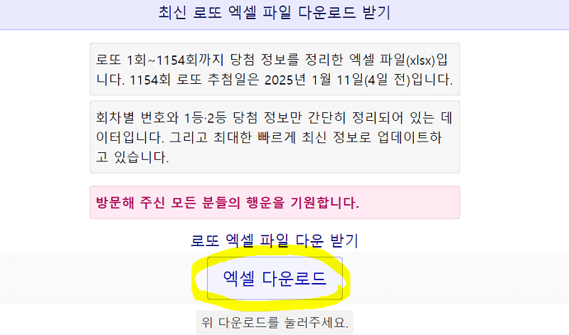 역대 당첨번호를 한꺼번에 정리하거나 분석하고 싶다면, 파일 다운로드를 활용하는 것이 가장 효율적입니다. 아래 로또 전문 사이트에서는 가장 최신까지 발표된 로또 회차의 당첨번호를 포함한 엑셀 파일 다운로드를 제공하고 있습니다. 별도의 로그인은 필요하지 않으며, [엑셀 다운로드] 버튼을 누르기만 하면 역대 회차별 로또 1등, 2등 당첨번호 리스트를 엑셀 파일로 다운로드할 수 있습니다. 현재는 1회부터 1154회까지의 당첨번호 리스트를 확인할 수 있습니다.